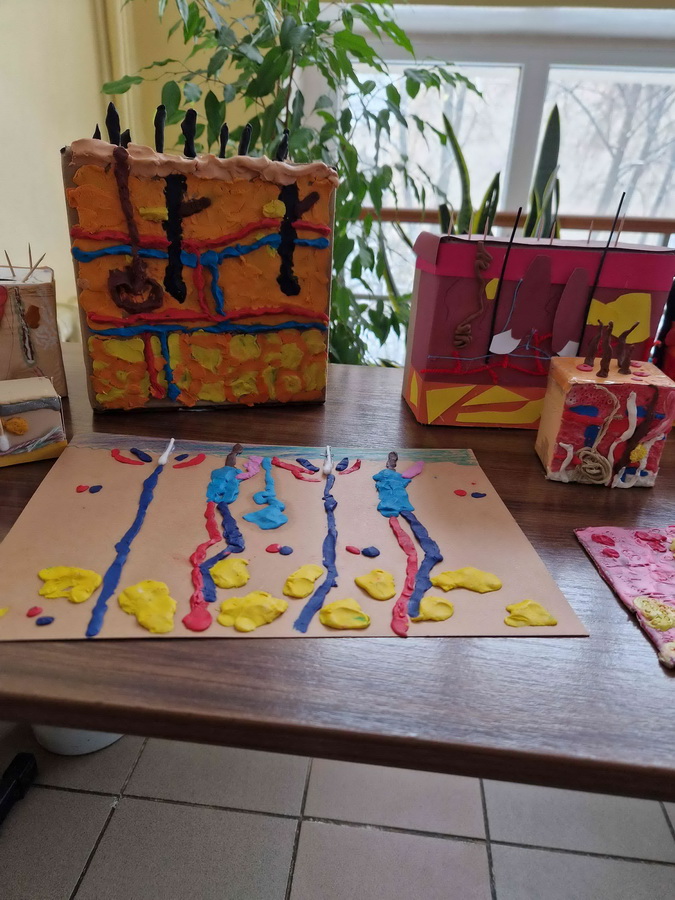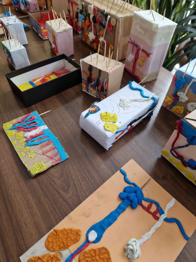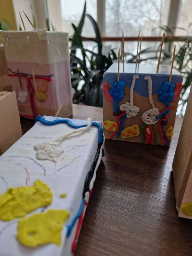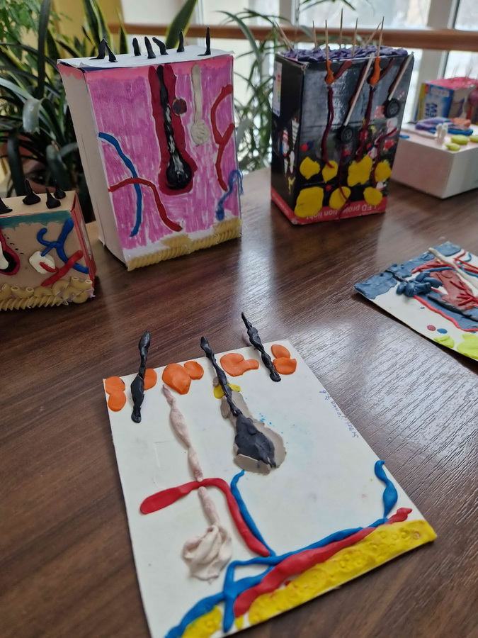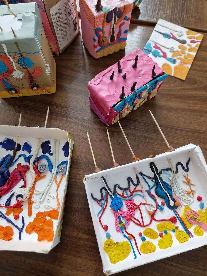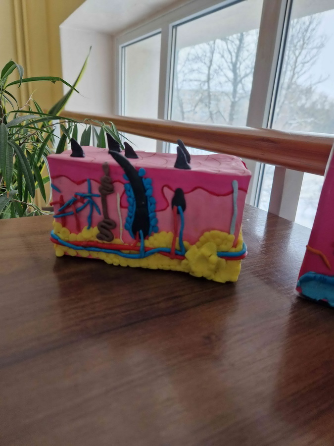Bioloģijas mācību procesā 7.klašu skolēni iepazinās ar ādas slāņiem, to uzbūvi un funkcijām. Lai teorētiskās zināšanas kļūtu saprotamākas un paliktu atmiņā, skolēni veidoja ādas modeli no dažādiem materiāliem. Darbos tika izmantots viss iespējamais – plastilīns, kartons, audumi, diegi, papīrs, vate un citi sadzīvē atrodami materiāli. Tas ļāva uzskatāmi attēlot epidermu, dermu un zemādas tauku slāni, kā arī matu folikulus, sviedru un tauku dziedzerus, asinsvadus.