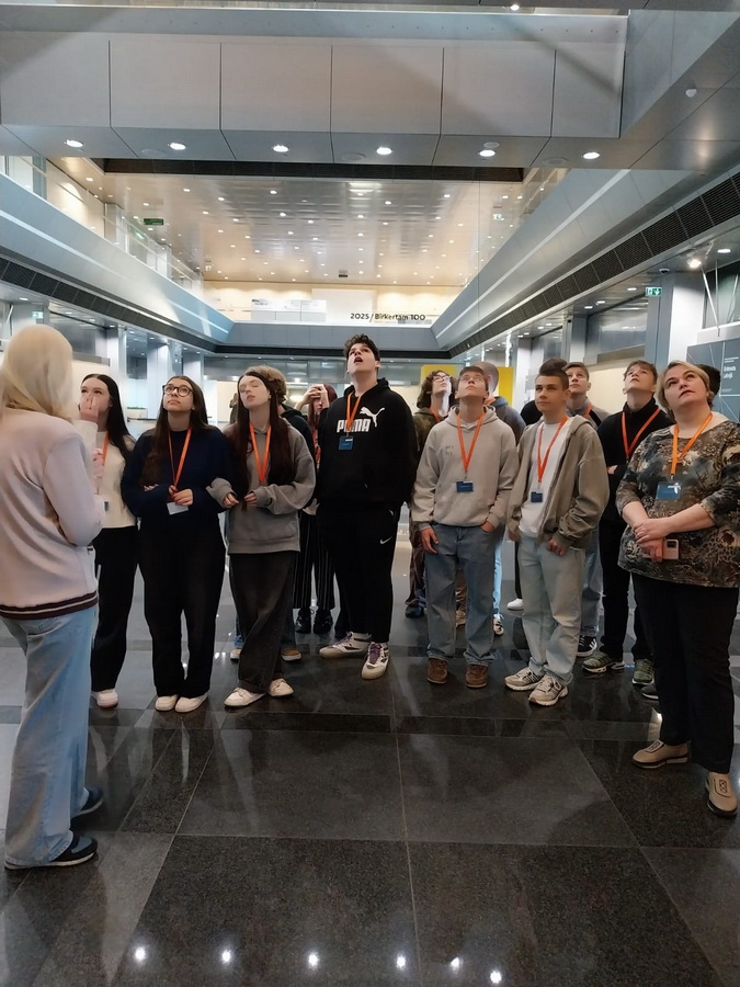 Ekskursijas laikā skolēni uzzināja interesantus faktus par ēkas arhitektu Gunāru Birkertu, kurš bibliotēku veidoja kā Gaismas pils simbolu — latviešu kultūras un zināšanu templi.